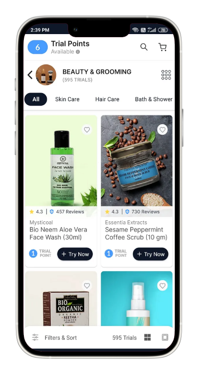Smytten allowed users to explore and purchase Trial Packs that contained sample-sized products from premium and luxury brands across various categories. Users can access exclusive offers, discounts, and promotions on premium products.